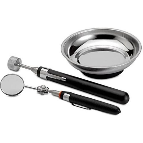 Katzco Magnetic Parts Trays – 3 Pack – Durable Holder with Pick-Up Tool and Telescoping Mirror for Garage, Mechanic, Home, Workshop, Construction Site