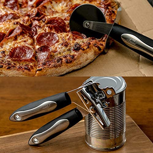 HANDLE ANY TASK: This complete 25-piece kitchen utensil set includes a solid turner, slotted turner, solid spoon, slotted spoon, spoon ladle, potato masher, whisk, spatula, tongs, cheese grater, pizza cutter, peeler, can opener, ice cream spoon, wine opener and measuring spoons.
