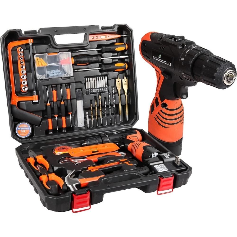 Included Components: (1) 8V Max Lithium Ion Drill, (1) Tool Bag, (1) Claw Hammer, (1) Tape Measure, (1) Adjustable Wrench, (1) Slip Joint Pliers, (1) Ratcheting Screwdriver, (1) Utility Knife, (4) Nut Drivers, (32) Screw driving Bits, (1) Level, (1) Drilling Bits, (1) Magnetic Bit Holder