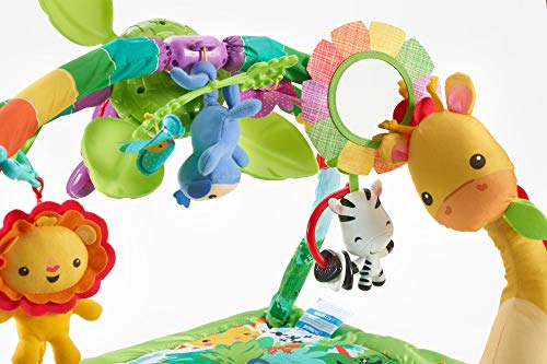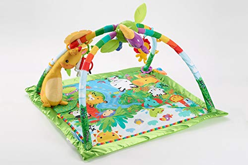 With a third play setting and more than 10 toys & activities, the Fisher-Price Rainforest Music & Lights Deluxe Gym keeps baby busy as a bee, at home or on the go! The rainforest comes to life with music, lights and nature sounds that respond to baby’s movement. During lay & play time, hanging activity toys & motion-activated music encourage teeny-tiny ones to reach, bat & play…hello, toucan! Lower the toys or move them to the soft deluxe mat to encourage baby to push up for tummy time fun! Sweet details, including a soft, satiny mat border and large crinkle leaf, offer sensory development as your little one plays. And, for extra on-the-go fun, remove the take-along toucan, which features up to 20 minutes of music in the long-play setting as well as cool, color-changing lights! Go wild, baby!