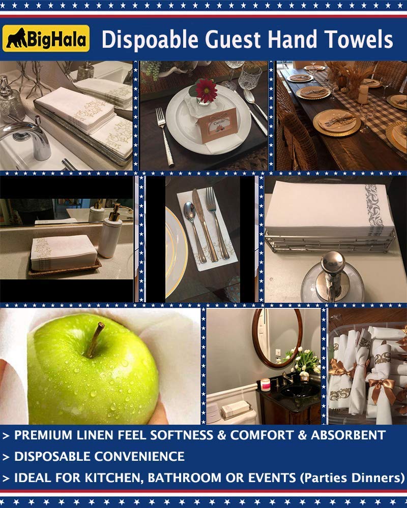 • ❤【PERFECT SUBSTITUTE for Cloth Napkin or Guest Hand Towels】 Look and Feel Like Real Linen Cloth Guest Hand Towels & Napkins,While You No Need to Pay the High Cost and Have Them Washed and Dried Anymore. Quality Eco Airlaid Paper CLOTH FEEL & LINEN LIKE Material Disposable Napkins ,Cost Effective and Disposable Convenience, Linenlike Quality Softness Comfortable & Absorbent, Giving You and Your Guest a Fresh Clean Spa Inspired Feeling with Every Details.