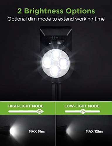 Improved Brightness & 2 Working Modes: With super brightness, this solar spotlight can cast a focused ray to highlight your flagpole or beautiful sculpture, even on the darkest of nights. You have the option to set from High Mode (MAX 6Hrs) to Low Mode (MAX 12Hrs) to extend working time.