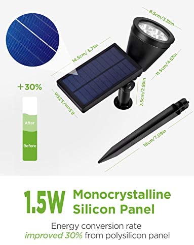 Advanced 1.5W Monocrystalline Silicon Solar Panel: The solar energy conversion rate is 30% faster than the old versions by using the latest technology and material. Solar spotlight detects the surrounding light condition and automatically turns on and off, a smooth panel surface keeps dirt and debris from accumulating and blocking sunlight.