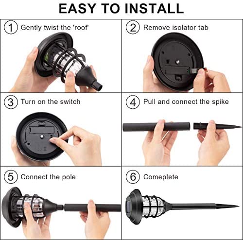 【Install Easily】Install in no addition tools or wiring required. Just remove the tab under the light cap, turn on the switch, pull out the bottom spike from the tube, install it and insert the solar patio light into the soft earth.