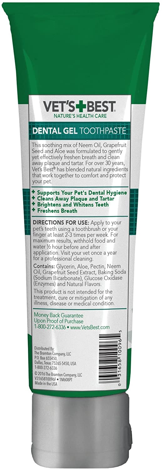 • SOOTHING AND EFFECTIVE – Vet’s Best Enzymatic Dental Gel Toothpaste is a veterinarian formulated soothing and effective mix of aloe, neem oil, grapefruit seed extract, baking soda, and enzymes.