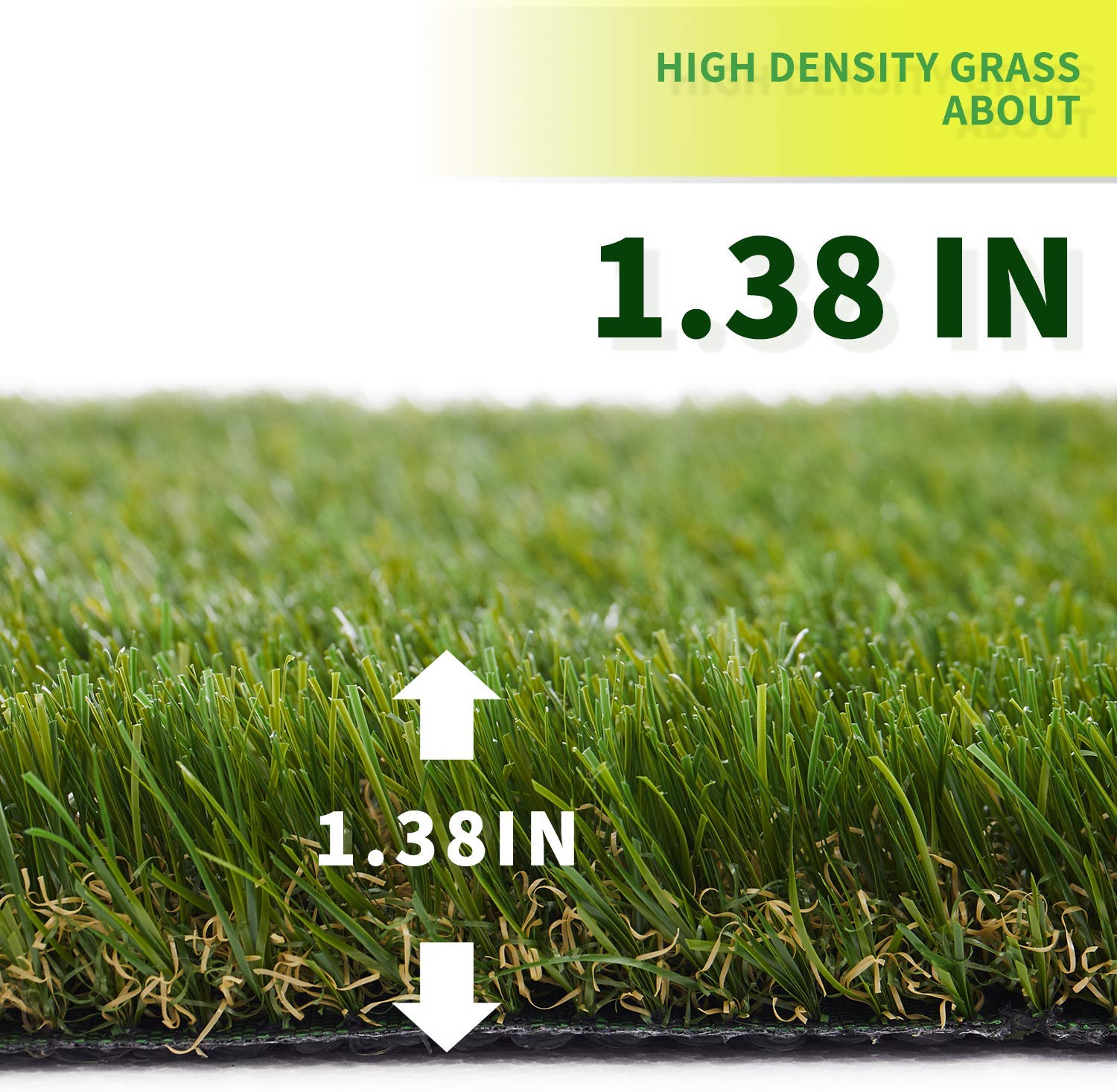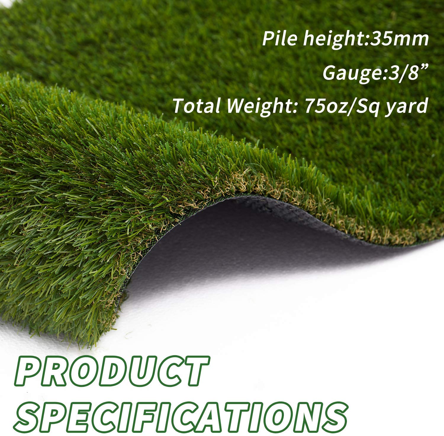 • PRODUCT DESCRIPTION: Heavy-duty Artificial turf grass that is 4 tricolored looking, made of PE “U” model yarn that has a comfortable touch. It’s two-layered backing is anti-aged PP weave cloth, designed with drain holes for easy water run-off. It’s back coating is made of styrene-butadiene rubber latex. The pile height is 35 mm, 75 oz/sq yard, gauge 3/8”.